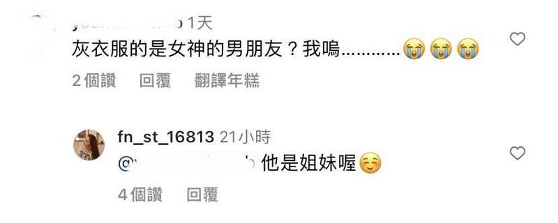 有網友好奇表示「灰衣服的是女神的男朋友?我哭…」庭庭本人親自回應「他是姐妹喔」一番言論讓心碎粉絲重新燃起希望。事實上,庭庭去年4月曾透露身旁沒有追求者,理想型是單眼皮、眼睛好看、175公分以上的,指出男星林彥俊符合其理想型。