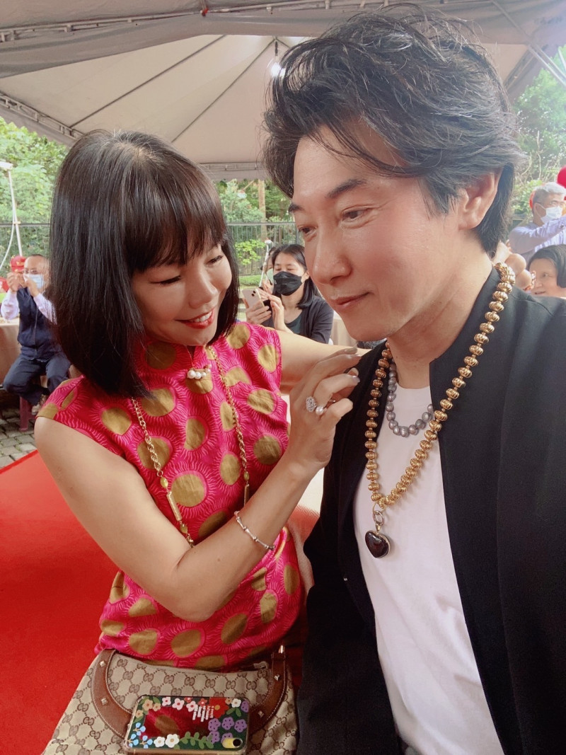 陳鴻(右)戴上金鎖鏈象徵成為「神農教主」。(陳鴻提供)