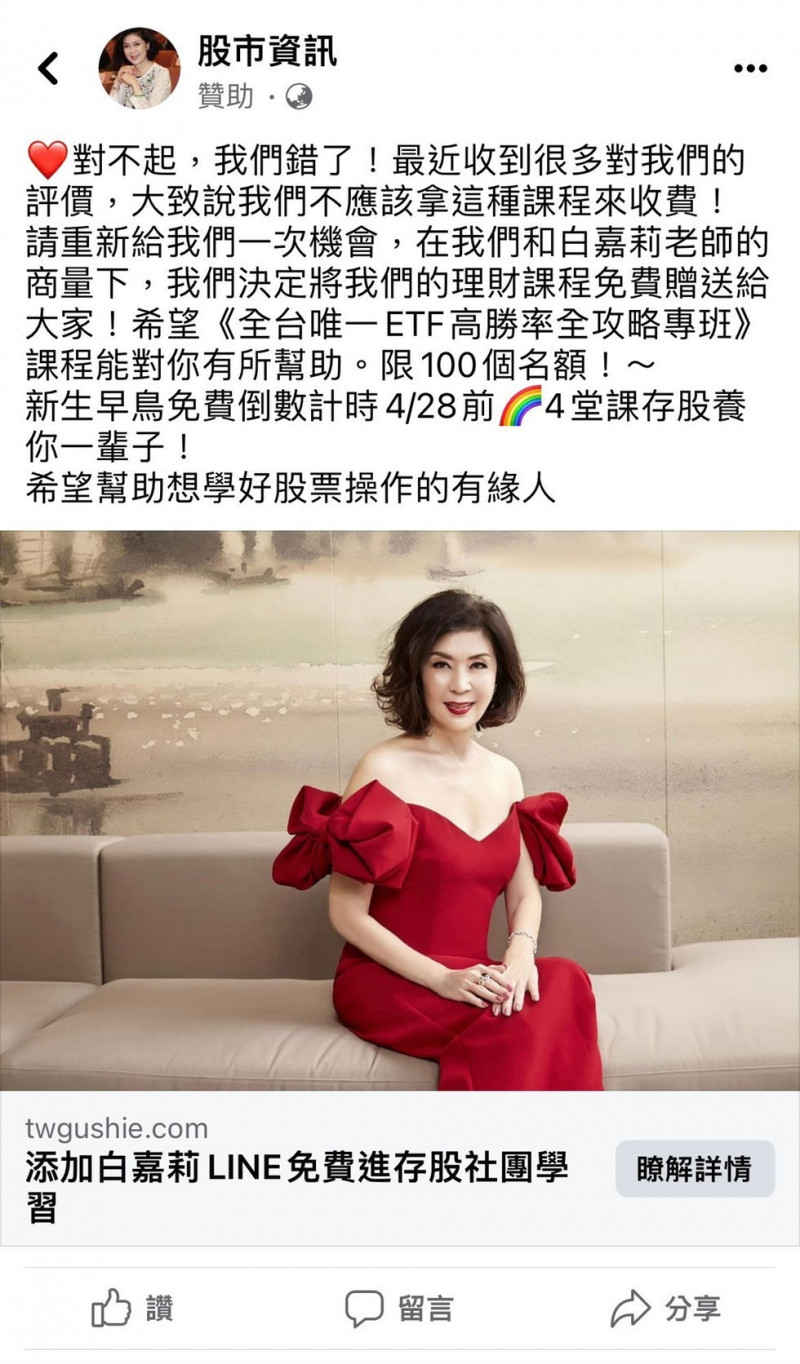 白嘉莉表示,有不肖份子盜用她的肖像,並在社群媒體發佈免費投資課程的訊息,表示是和白嘉莉討論之後決定開出免費的投資學習課程造福大眾,請加line加入免費學習存股課程。對此,白嘉莉嚴正聲明:「這完全是欺騙大眾的行為,完全沒有我的允許。經由友人告知我才知道社群媒體已經開始刊登這個廣告,為免粉絲還有消費者上當受騙,緊急特此聲明。」
