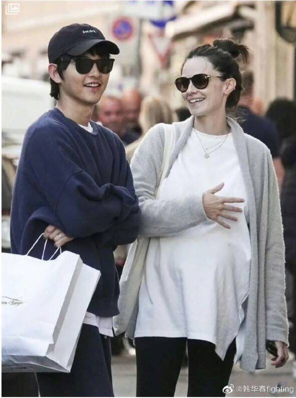 宋仲基身穿藍色大學T,戴著黑色墨鏡,而凱蒂則繫著包包頭,身穿白色寬鬆上衣,孕肚已經非常明顯。夫妻倆手牽手走在羅馬街頭上宛如一幅畫般,宋仲基還不時地摟著凱蒂的肩膀,互動相當親暱,還對視一笑,沉浸在新婚的喜悅中。
