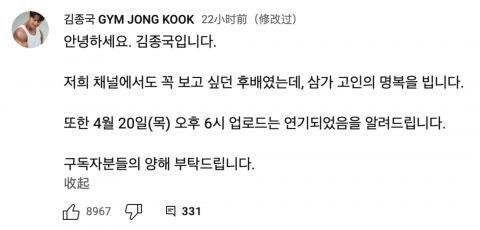 金鍾國宣布停更一週悼念文彬。(翻攝自YouTube/GYMJONGKOOK)