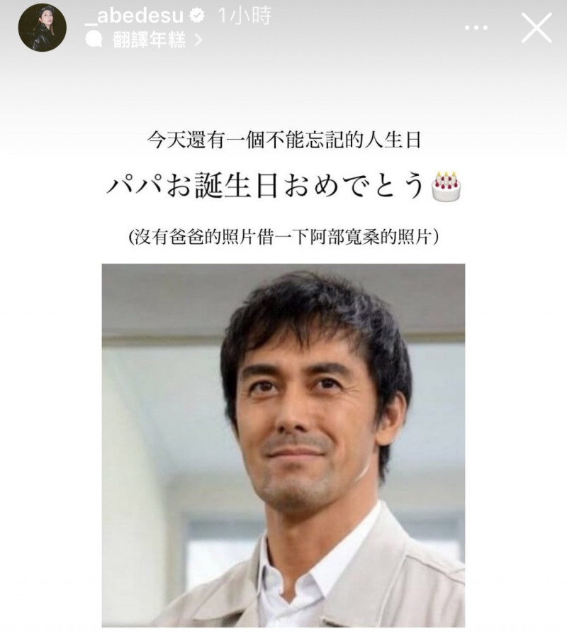 阿部瑪利亞借用日本男星阿部寬照片,祝賀她的爸爸生日快樂。(翻攝自IG)
