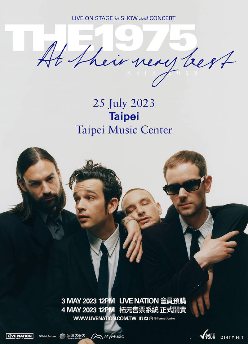 The 1975將在7月25日星期二登上臺北流行音樂中心表演廳,於5月3日星期三中午12點,以Live Nation Taiwan會員搶先預購門票,5月4日星期四全面於拓元售票啟售門票,詳細情形請至Live Nation Taiwan理想國粉絲專頁及拓元售票查詢。
