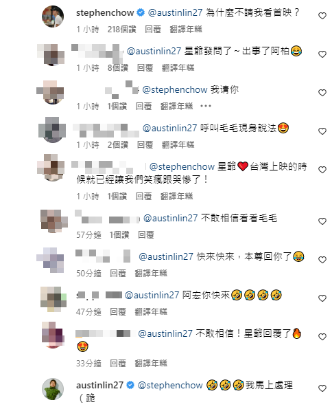 星爺稍早在IG發文寫下,「五一假期,最好就是看電影,求古今中外必看和千萬不要看電影指引。」另外還幽默附註「小弟的電影可免,我不想看」,引起大批網友湧入推薦,男星林柏宏也留言「星爺,《關於我和鬼變成家人的那件事》正在香港上映中!」沒想到星爺卻反問,「為什麼不請我看首映?」