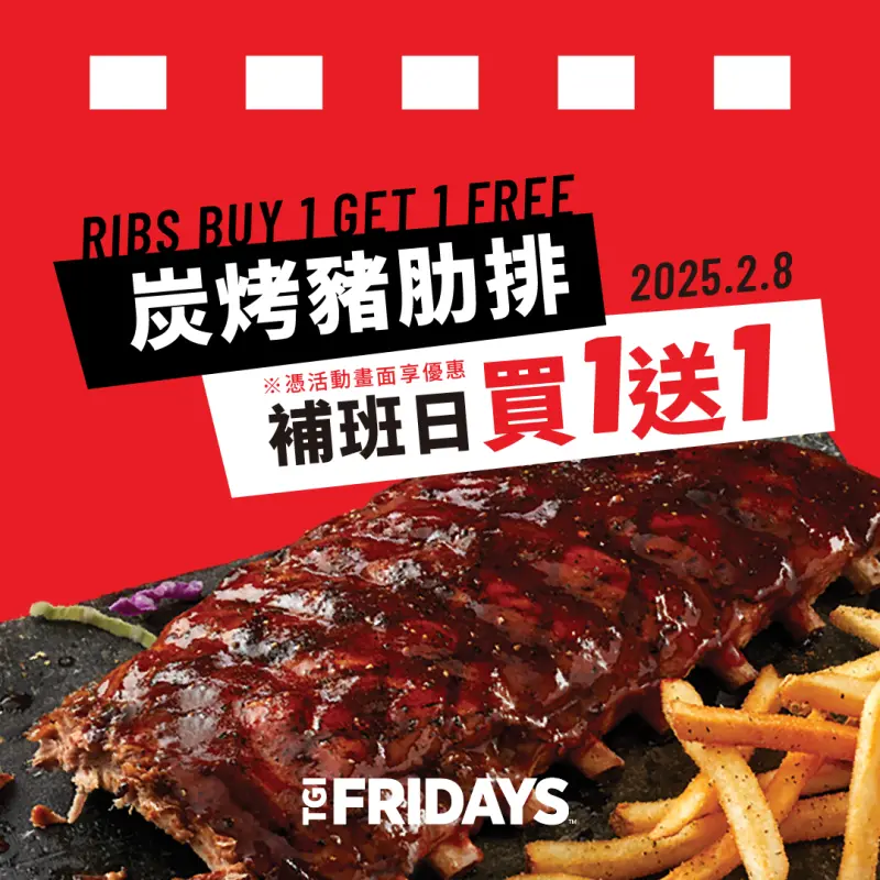 2月8日補班日,至TGI FRIDAYS全台分店消費,不分內用外帶,憑指定畫面即享「炭烤豬肋排買一送一」!全日可享全排、半排或任何風味皆「買一送一」,每桌至多買二送二。提醒大家,優惠組合(含贈送之品項)內用及外帶,均需加收原價之10%服務費;優惠不併用。