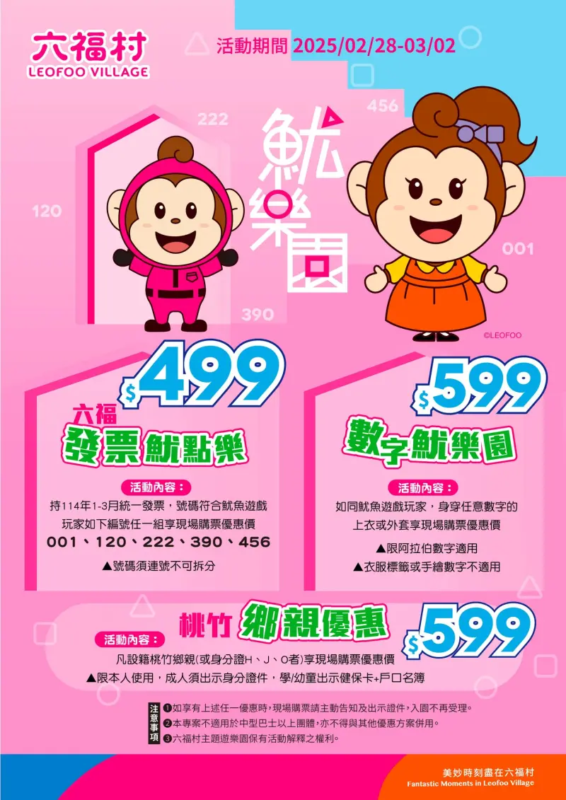 六福村2月28日至3月2日連假期間,推出「六福發票魷點樂」發票號碼對對碰優惠,於六福村現場購票,持114年1-3月統一發票、發票號碼連續三碼對中《魷魚遊戲》第二季指定角色玩家編號(001、120、222、390、456)任一組,可享門票優惠價499元(號碼須連號不可拆分);「數字遊樂園」則主打如同《魷魚遊戲》玩家,身穿任意數字號碼的上衣或外套,現場購票享599元優惠價(限阿拉伯數字適用;衣服標籤或手繪數字不適用)。