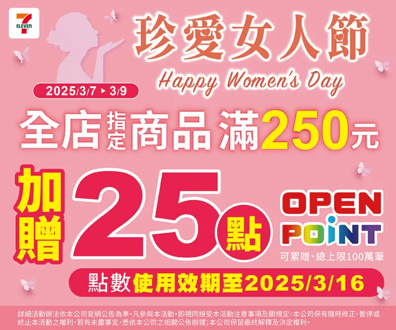 7-11自3月7日起至3月9日,活動期間會員於結帳時報手機號碼、結帳時出示會員條碼,或以已綁定會員之icash2.0/OPEN錢包/icash Pay單筆全額支付活動指定品項滿250元,即加贈OPENPOINT點數25點,每會員回饋無上限,單筆可累贈。(贈送點數使用期限至3月16日前,總活動筆數上限100萬筆)