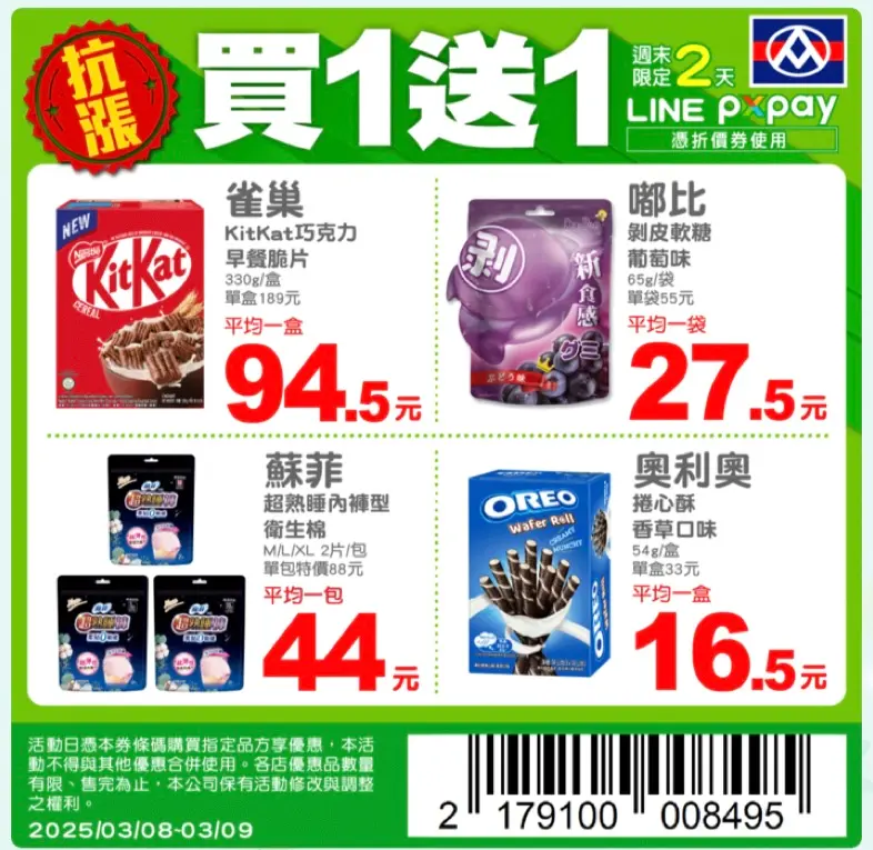 全聯LINE好友限定隱藏優惠出爐,本週誠意滿滿,不僅有超熱門的民生用品「蘇菲超熟睡內褲型衛生棉」買一送一,還有「雀巢巧克力早餐脆片」、「OREO捲心酥」、「嘟比 葡萄口味剝皮軟糖」也買一送一,僅限週六、週日(8日、9日),結帳時需要刷折價券條碼可優惠,不過也可出示以下圖片給櫃檯人員刷條碼即可。
