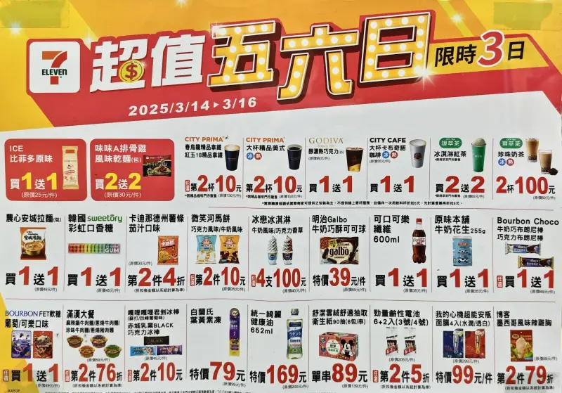 3月14日白色情人節快樂!四大超商推出咖啡限定優惠,7-11本週五六日春烏龍精品拿鐵、精品美式第二杯10元,還有大杯卡布奇諾、GODIVA醇濃熱巧克力買一送一;全家今起特濃拿鐵、特大冰4水果茶加10元多一杯,週末康康五霜淇淋買一送一。