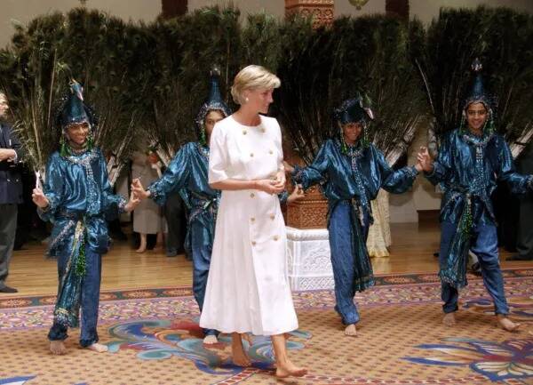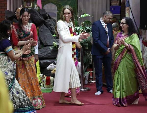 凱特參訪Aakash Odedra Company及印度教寺廟時,毫不介意脫下鞋子赤腳入內,並開心與民眾共舞。此畫面讓人聯想起1997年黛安娜王妃造訪倫敦Neasden寺廟也是一樣穿著俐落白色套裝,並赤腳進入寺廟的往事。