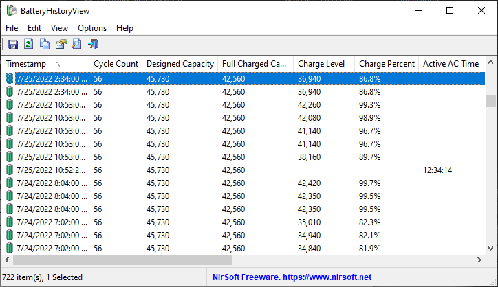 BatteryHistoryView extracts and displays the battery history information stored in the SRUDB.dat database of Windows 10 and Windows 11.