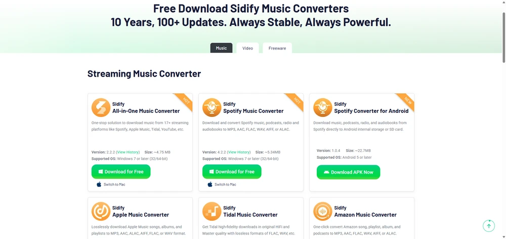 Download Sidify Music Converter, Sidify Apple Music Converter, Sidify Amazon Music Converter, Sidify Tidal Music Converter, and Sidify All-In-One, to convert music to MP3, AAC, FLAC, WAV, AIFF, or ALAC format for enjoyment.
