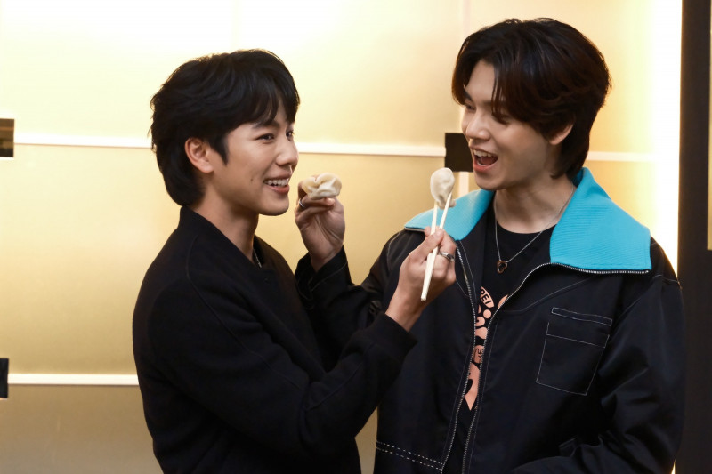 YinWar上演餵食秀。(大國文化提供)〔記者廖俐惠/台北報導〕人氣泰劇《學長的愛情攻心計:愛情力學》的主要演員Yin和War,本週日(5日)在新莊舉行「蜜月」粉絲見面會,兩人在2天前就先來台,結果卻錯估天氣,趕緊到服飾店買衣服,竟意外引起搶購潮,同款衣服被粉絲們掃光。YinWar今天受訪一聽笑了出